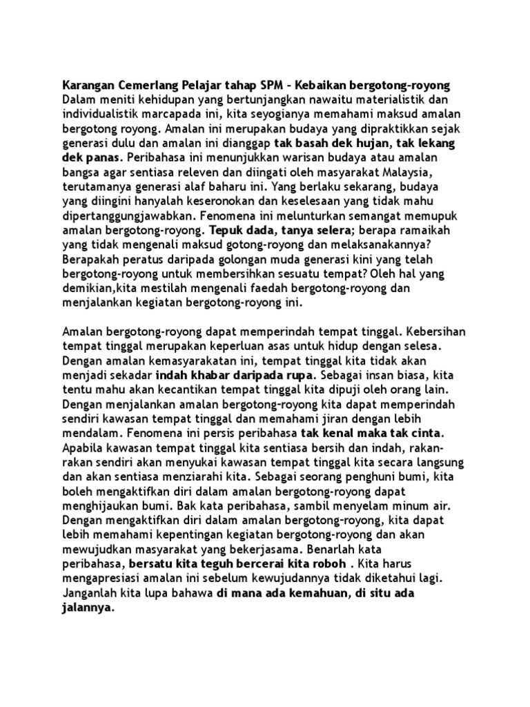 Contoh karangan cemerlang bahasa melayu spm 1. Di samping itu amalan bergotong-royong memberikan kelebihan kepada setiap ahli masyarakat kerana ia akan memudahkan tugasan atau objektif yang ingin dicapai. Hari ini saya akan menyampaikan syarahan yang bertajuk Kepentingan Amalan Gotong-royong.